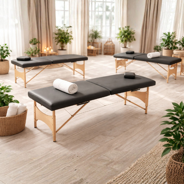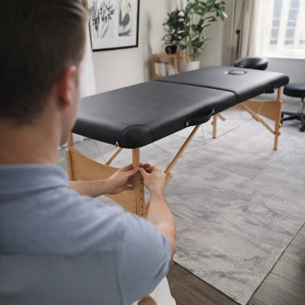 L’installation est simple : la table se déplie et se met en place rapidement. Certains accessoires (têtière, accoudoirs) se fixent en quelques secondes.